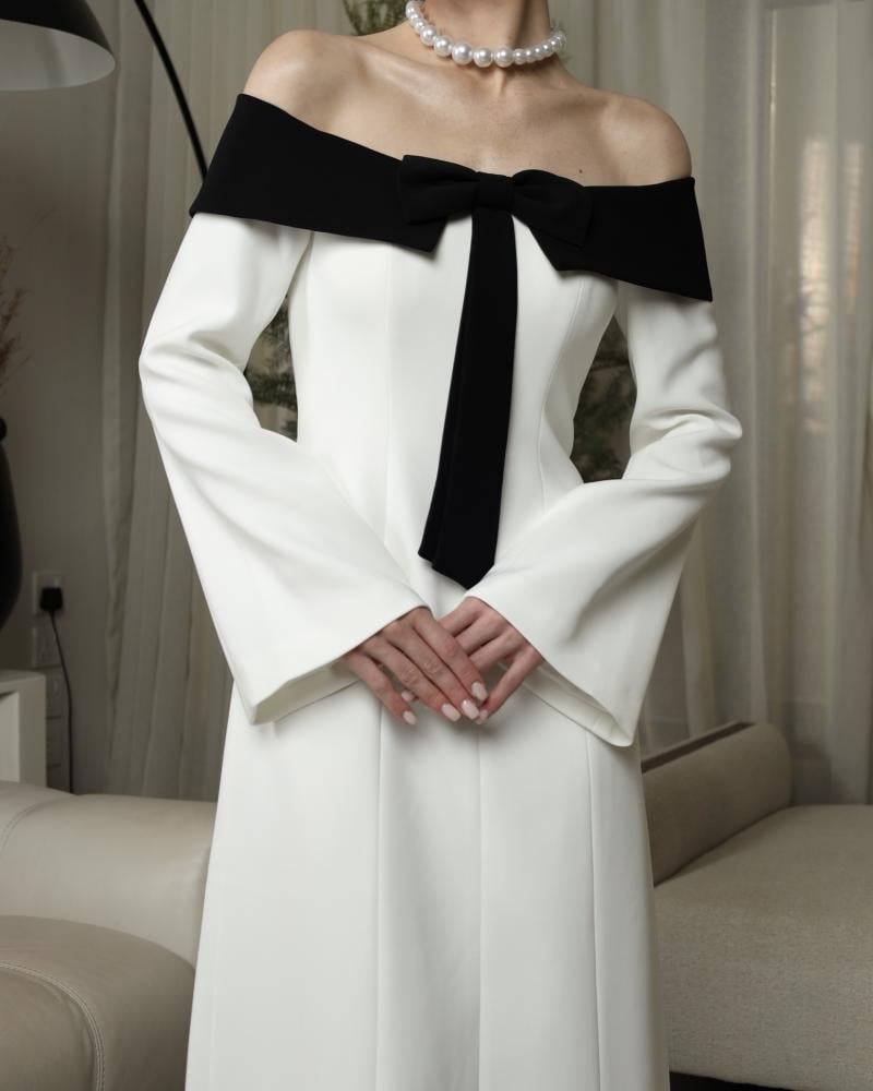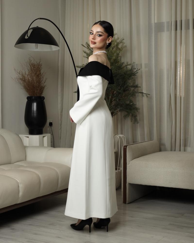 An elegant off-shoulder dress that features refined details, combining luxury and quality. Crafted from thick fabric, making it perfect for winter, and fully lined for a polished and comfortable look. The design is enhanced with black velvet fabric for the tie and collar. The dress includes padded cups and boning support to enhance the shape and flatter the silhouette.